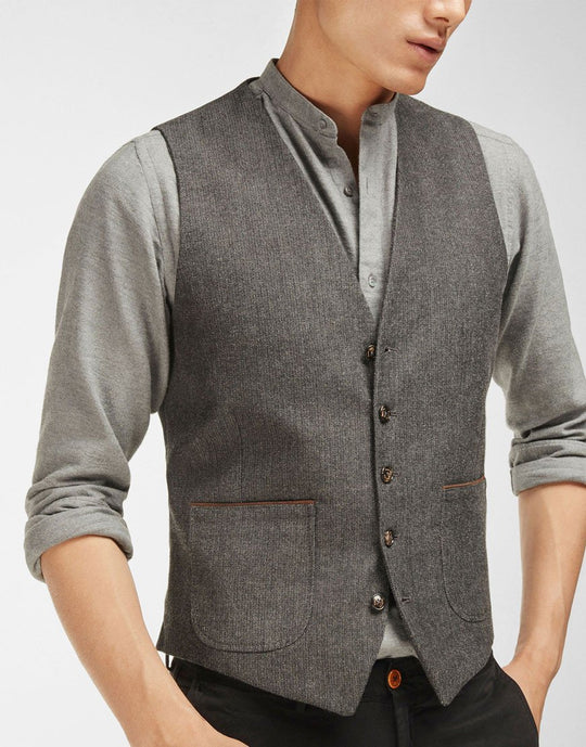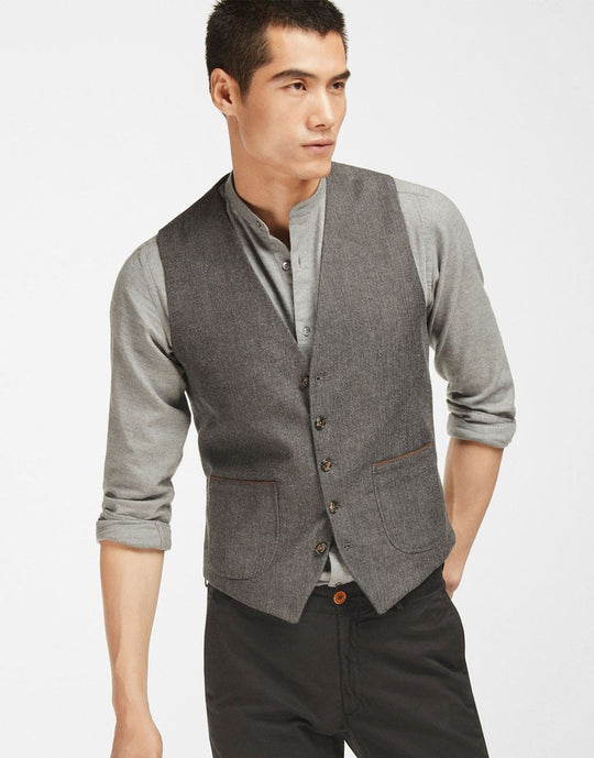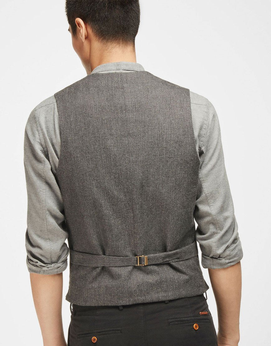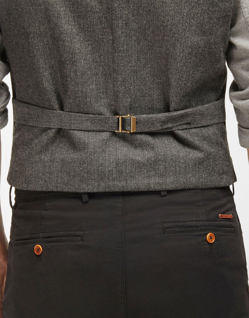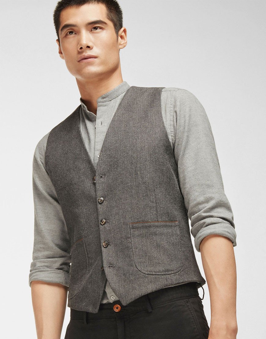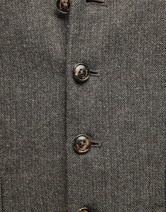 Gathered vest made of 100% cotton fabric. Slightly trimmed cut, V-neck and zip with five button front button. Two patch pockets with contrasting contrast, buckle with adjustable strap on the back, lining and an inside pocket.